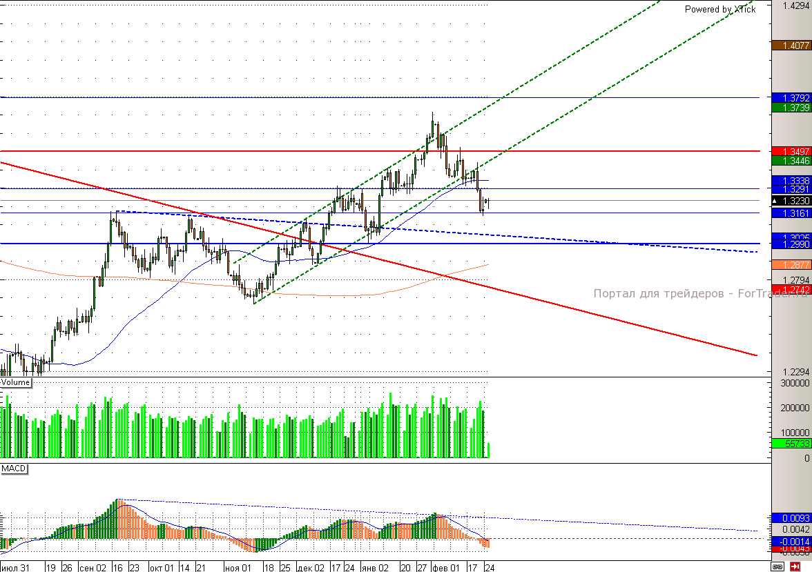 На текущий момент пара евро/доллар консолидируется вблизи отметки 1,315, пробой которой может придать текущему снижению дополнительное ускорение. В первую очередь давление на европейскую валюту оказывает снижение агентством Moody’s суверенного рейтинга Великобритании с Aaa до Aa1. Дополнительным риском для евро являются продолжающиеся выборы в Италии. В случае возвращения в парламент Берлускони, евро может уйти сильно ниже. Между тем оптимистичные данные по индексу настроений в деловых кругах Германии, вышедшие еще в пятницу, удерживают европейскую валюту от более сильного падения.