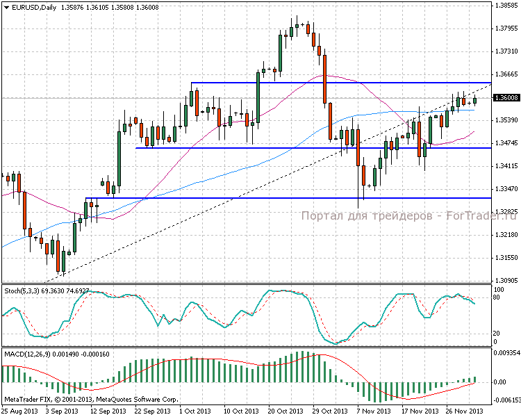 В прошлую пятницу агентство S&P снизило кредитный рейтинг Голландии, одновременно повысив рейтинг Кипра с ССС+ до В-. Также был пересмотрен прогноз по рейтингу Испании в сторону повышения. В субботу международное агентство Moody’s повысило кредитный рейтинг Греции сразу на две ступени – с С до Саа3. Единая валюта слабо отреагировала на эти положительные новости – цена стабилизировалась в районе отметки 1,3600. Гистограмма MACD по инерции указывает на рост, стохастик вышел из зоны перекупленности.