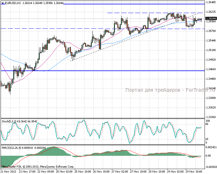На часовом таймфрейме была пробита линия тренда и рынок перешел во флет, консолидировавшись в диапазоне 1,3580-1,3620. SМА20 пересекла SМА50 сверху-вниз, индикатор MACD переместился в отрицательную область.