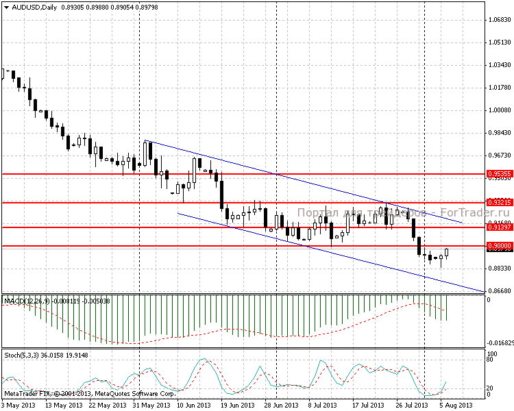 На часовом графике видим, что цена пробила линию тренда и уже сегодня на азиатской сессии протестировала ее с обратной стороны с последующим отскоком вверх. Сейчас цена консолидировалась возле 0,9000, MACD-гистограмма вышла в положительную область и нарастает, стохастик указывает на локальную перекупленность.