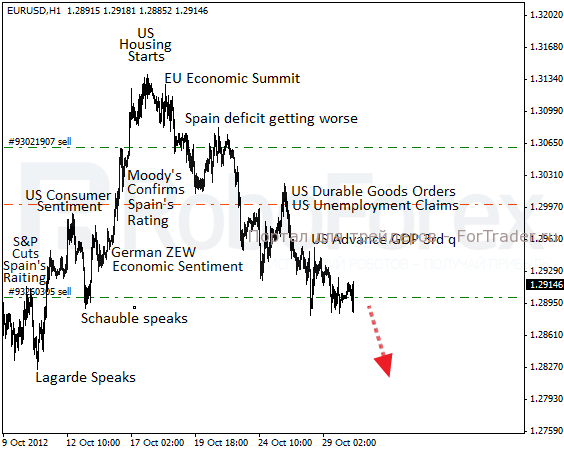 Вместе с тем, ФРС продолжает проводить QE3, ежемесячно покупая ипотечные облигации на $40 млрд, но на рынках этого словно не замечают, хотя предыдущие два QE сопровождались стремительным обвалом доллара. Ожидаемого ослабления доллара не происходит во многом из-за бегства части инвесторов из еврозоны — американская валюта по-прежнему воспринимает как относительно безопасное убежище, несмотря на накопившиеся проблемы в экономике Штатов. Рост ВВП в III квартале на 2% также оказал поддержку медведям по EUR/USD.