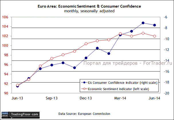 Признаком того, что неустойчивое восстановление экономики Еврозоны находится под угрозой, является незначительное снижение Еврокомиссией оценки потребительского доверия в июне. Как ожидают аналитики, в публикуемом сегодня отчете показатель останется на прежнем уровне. Однако принимая во внимание то, что обстановка на Украине накаляется, рискуя повлечь за собой экономические последствия для всех стран Европы, возможностей для иного толкования неутешительных входящих данных очень мало.
