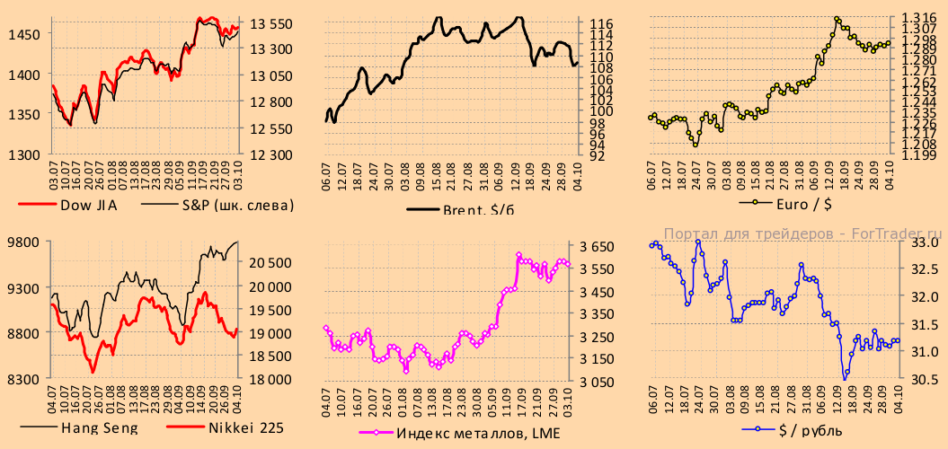 Европа. Биржи в основном показали рост, FTSE 100 =+0,28, DAX =+0,22, CAC 40 =-0,24%. Можно предположить, что опровержение премьер-министром Испании слухов о том, что страна собирается обратиться за финансовой помощью к ЕС, является чисто политическим ходом — отложить проблемные вопросы до прохождения в стране региональных выборов (21 октября). Теперь рынки ожидают решения рейтингового агентства Moodys относительно инвестиционного рейтинга Испании. В Греции продолжается работа представителей кредиторов (ЕЦБ, ЕС и МВФ) с правительством по согласованию мер по сокращению расходов бюджета на предстоящие 2 года на сумму 11,5 млрд. евро.