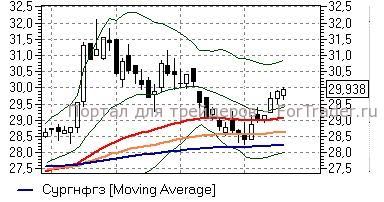 Сургутнефтегаз ао (+0,01%) – акции на этой неделе закрепились выше средней полосы Боллинжера дневного графика (29,5 руб), что является хорошим для «быков» сигналом, указывающим на неплохие шансы бумаг развить повышение в район верхней полосы Боллинжера (30,9 руб). Технические индикаторы дают умеренно положительные сигналы, не исключая «бычьего» сценария, но и предупреждая игроков о необходимости соблюдать осторожность. Неспособность устоять выше отметки 29,5 руб поставила бы под вопрос актуальность игры наверх.