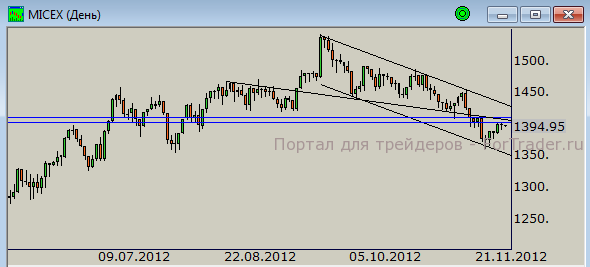 Вчерашний день показал, что так просто покупатели не смогут вернуться себе отметки 1400-1410 пунктов, которые сейчас выступают сопротивлениями. Уровень предложения здесь начал возрастать, что накануне вылилось в консолидацию. Таким образом, покупатели вновь начали проявлять слабость. Технически отбой от текущих сопротивлений вниз будет триггером к движению в район нижней границы канала — отметке 1350 пунктов.