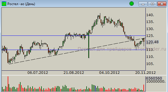 Последние события в компании привели к довольно волатильной сессии на торгах во вторник. В течение дня бумага смотрелась хуже широкого рынка. Технически отскок от локальной поддержки — отметки 115 рублей, позволил покупателям протестировать бывший восходящий тренд, который теперь выступает в качестве сопротивления. И как видно, уровень вчера отработал на все сто. Вполне вероятно, что бумага в ближайшие дни будет весьма волатильной. Мы полагаем, что цены продолжат движение в диапазоне 125-115 рублей.