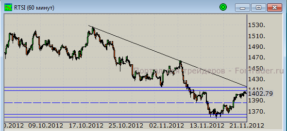 В настоящее время цены достигли значимых уровней сопротивления, которые расположены в районе отметки 1410 пунктов. Накануне покупатели так и не набрались сил на их преодоление. Учитывая, что общая тенденция пока нисходящая, откат с текущих значений может привести котировки к новому тестированию недавних минимумов. При негативном для покупателей сценарии развитии событий ближайшей локальной поддержкой для них будет выступать отметка 1390 пунктов. Именно ее пробой даст толчок к движению индекса к нижней границе краткосрочного диапазона.