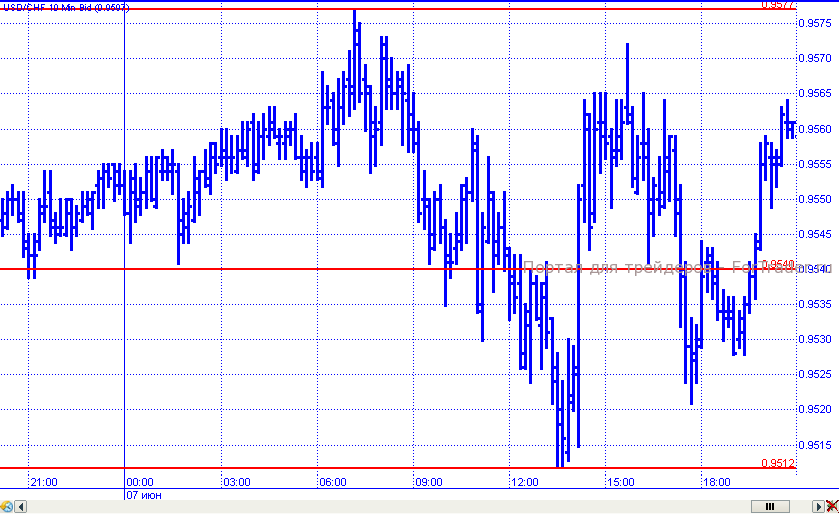 В течение торговых суток в четверг пара удерживалась в пределах неширокого диапазона (0,9512 – 0,9577). В начале дня пара устремилась к сопротивлению 0,9570 и попыталась его преодолеть, но неуспешно. В результате цены возобновили нисходящее движение, в рамках которого преодолели поддержку 0,9540 и достигли внутридневного минимума на 0,9512. Впоследствии была предпринята очередная попытка возобновить рост и торговый день пара завершила на отметке 0,9560.