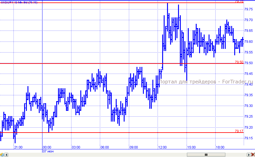 Пара доллар/иена медленно, но достаточно уверенно, движется вверх. От уровня 79,17 цены начали рост, в рамках которого преодолели отметку 79,50 и продолжили подъем к сопротивлению 79,80. Развить восходящее движение дальше не удалось и остаток торговых суток пара провела в пределах диапазона 79,50 – 79,80.