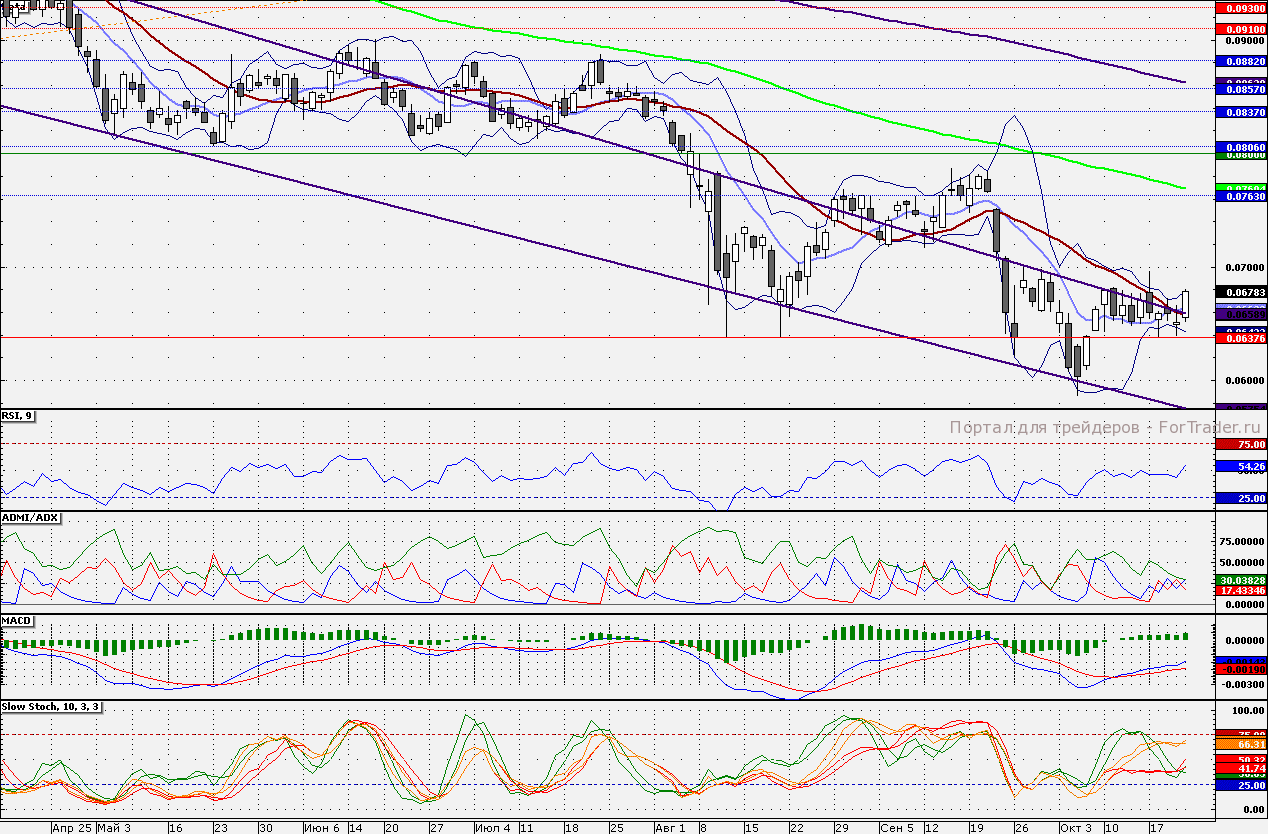 Акции ВТБ в пятницу мощно отскочили вверх и закрылись в районе значимого сопротивления 6,8 коп. Сегодня внешний фон располагает к пробитию вверх данной отметки, после чего акции могут продолжить рост с целью достижения 7,0 коп. Поддержкой является 10-дневная скользящая средняя 6,632 коп.