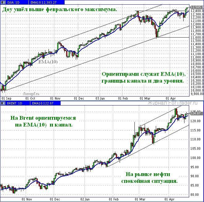 С начала апреля индекс Доу-Джонса тестирует уровень сопротивления 12 400. При откате вниз вполне достижимой целью служит поддержка на отметке 11 600, соответствующей мартовскому минимуму. Кроме того, ориентирами могут выступать скользящее среднее ЕМА(10), рисующее линию текущего краткосрочного тренда, и границы долгосрочного канала, который просматривается на дневном графике.