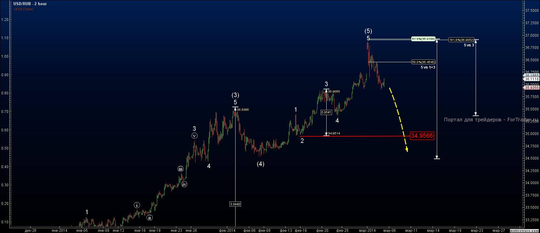 Несмотря на импульсивность и неопределенность движений в последнее время, наша старая разметка все еще актуальна, после внесения некоторых изменений. Как и прежде ожидаем развития коррекции, а максимум 36.90 расцениваем как вершину тренда на данный момент.