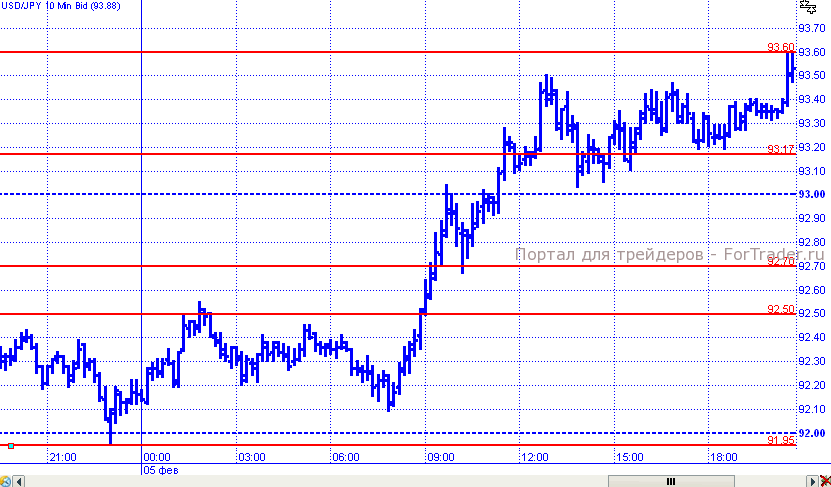 Пара доллар/иена в первые часы торговых суток протестировала поддержку 92,00 и, отметив минимум на 91,95, возобновила рост, который на короткое время был сдержан уровнем 92,50. Впоследствии этот барьер был взят, равно как и ранее отмеченный максимум 93,17 и пара продолжа движение вверх, завершив день в районе уровня 93.60.