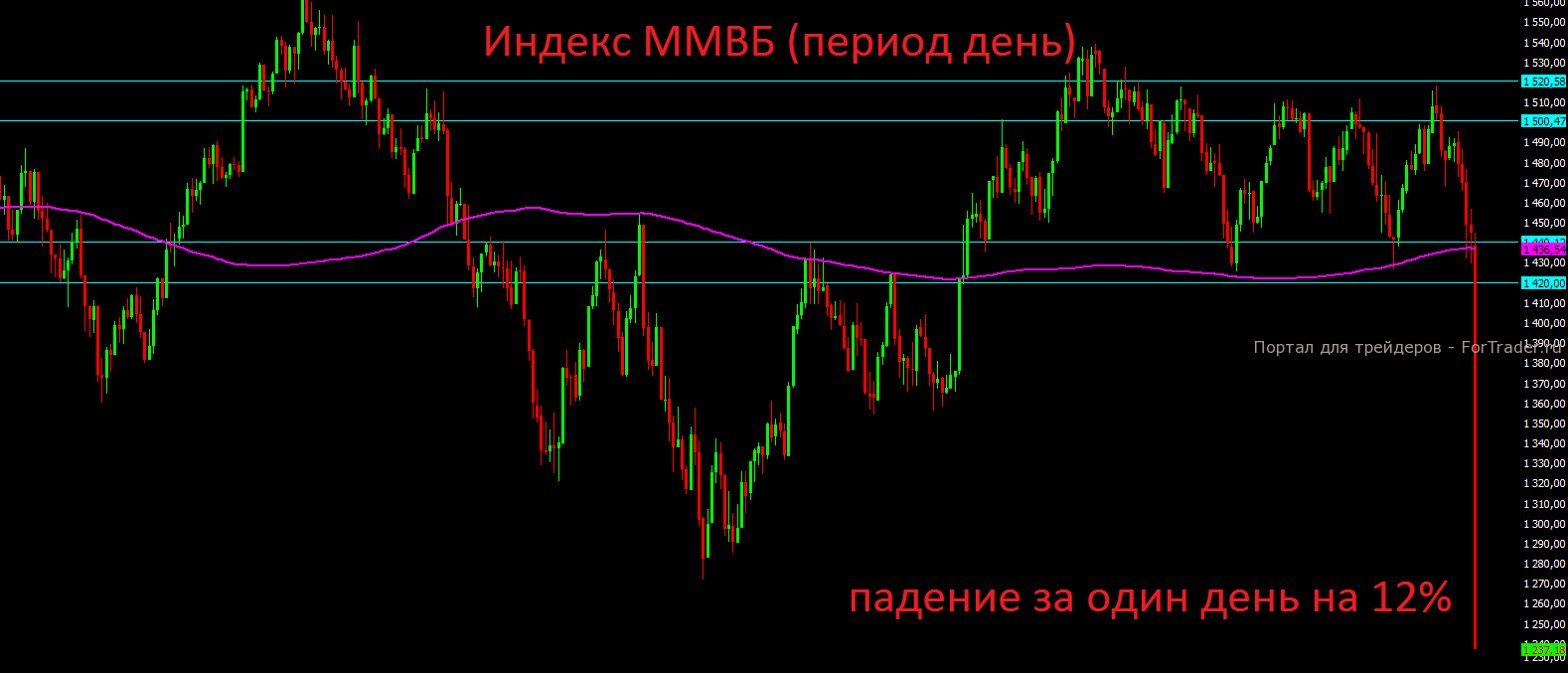 Торги на российской бирже в понедельник закончились обвалом. Рублёвый индекс ММВБ потерял 12%, а валютный индекс РТС почти 13%. Потери по индексам в течение почти всего дня превышали 10-11%, а акции многих компаний теряли 15-20%. Капитализация российских компаний упала за один день более чем на 2.5 трлн. рублей.