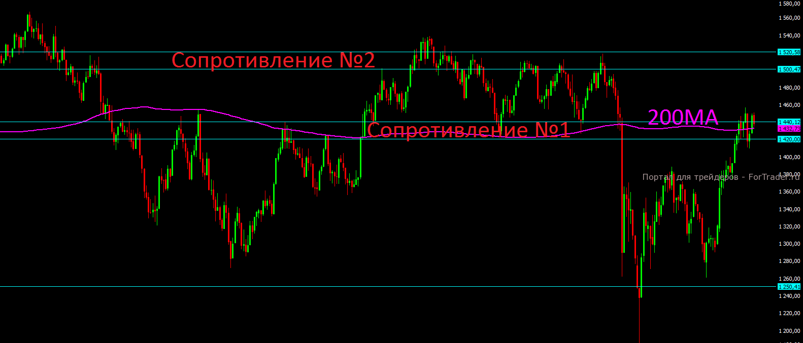 Более локальная техническая картина по российскому индексу ММВБ пока не даёт чётких ориентиров для движения на ближайшие несколько дней. Индекс ММВБ уже десятый день торгуется близи 200-дневной скользящей средней и вблизи важного диапазона сопротивления с границами 1420-1450 пунктов. Ещё на прошлой неделе мы отмечали, что без снятия локальной перекупленности цена вряд ли сможет пойти выше, теперь спустя несколько дней станет ясно, была это проторговка и плоская коррекция перед новым витком роста, или в этом диапазоне уже две недели аккуратно разгружали свои портфели крупные игроки и цена пойдёт вниз. Возможно, именно четверг и пятница окончательно определят движение на весь первый летний месяц.