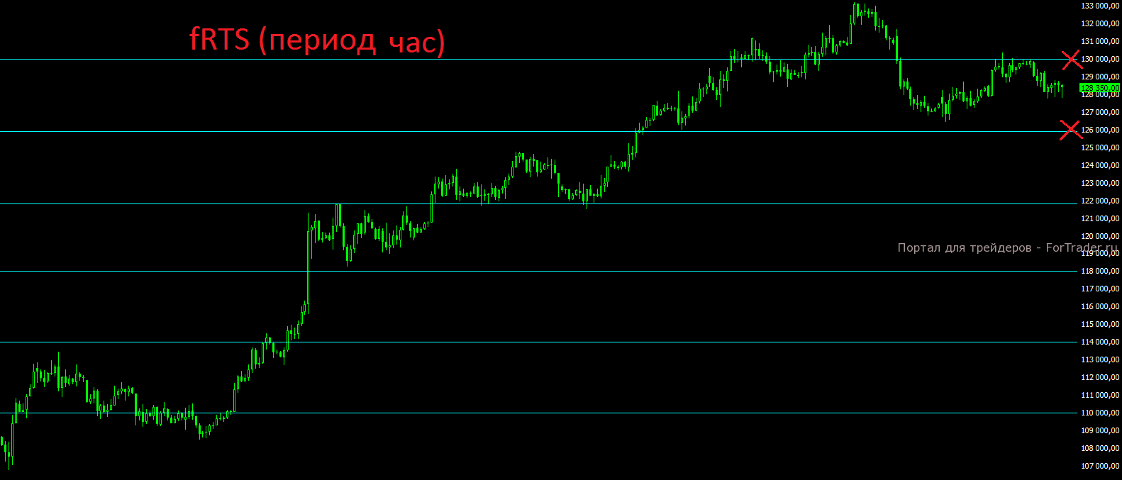 Что же касается локальной ситуации по фьючерсу на индекс РТС, то цена уже третий день зажата в коридоре 126000-130000 пунктов. В пятницу цена оттестировала ранее пробитую поддержку на отметке 130000 в качестве сопротивления и опустилась чуть ниже. Сегодня вновь есть шансы увидеть ещё один заход к отметке 130000 пунктов. В случае закрытия дня ниже отметки 126000 пунктов, мы начнём закладываться на дальнейший негативный сценарий.