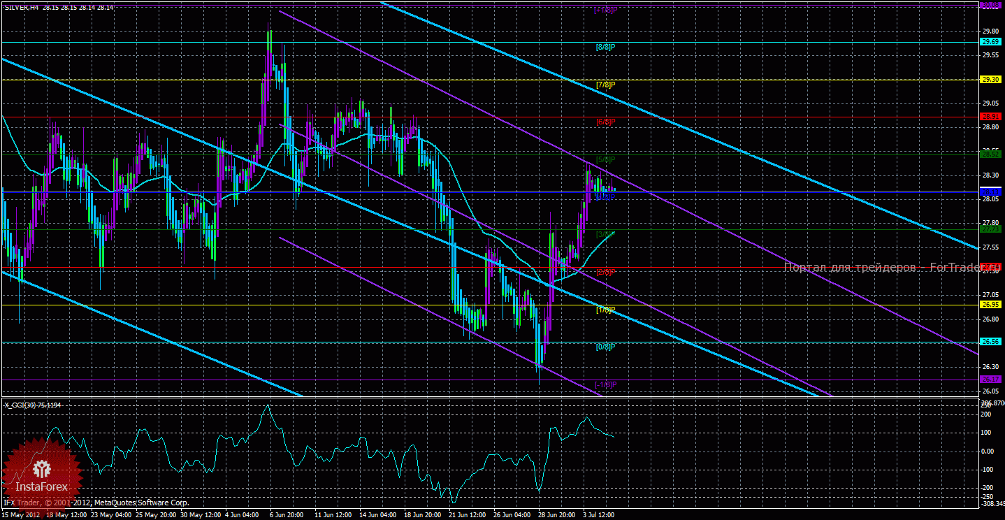 Исходя из анализа серебра 5 июля, видно, что цена продолжает находиться выше скользящей средней, но длинные позиции не рекомендуется рассматривать до разворота каналов наверх. Старший канал направлен вниз, что свидетельствует о нисходящем направлении движения глобального тренда. Младший канал также направлен вниз, что означает нисходящее движение и в менее долгосрочном плане. Сейчас цена находится выше мувинга и выше уровня Мюррея «4/8», что делает более вероятным продолжение восходящего движения. Первой целью восходящего движения является уровень Мюррея «5/8» — 28,52, однако, до разворота одного из каналов линейной регрессии наверх отторговывать эту цель не рекомендуется. Если курс серебра сумеет закрепиться выше этого уровня, то восходящее движение может продолжиться с целью «6/8» — 28,91. Скользящая средняя направлена вверх, а цена в свою очередь находится выше нее, что сигнализирует о текущем восходящем направлении движения. Длинные позиции будут вновь актуальны только после разворота одного из каналов наверх. Ордера на продажу будут актуальны только после обратного закрепления цены ниже мувинга. Хайкен Аши окрасил последние бары в фиолетовый цвет, что сигнализирует о локальном восходящем движении, но при любом положении индикатора открывать длинные позиции не рекомендуется. Индикатор CCI находится около уровня 100, что свидетельствует о небольшой перекупленности инструмента.