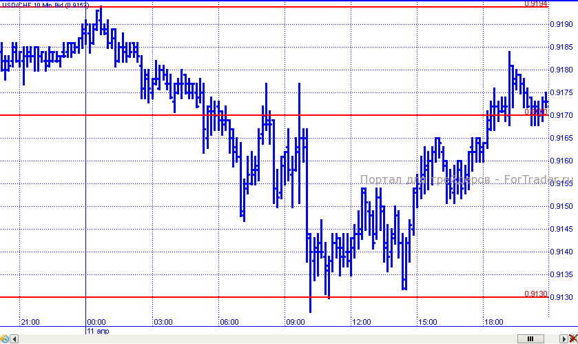 В среду франк традиционно оставался под влиянием общерыночных настроений. В первой половине торговых суток пара демонстрировала нисходящее движение, в рамках которого достаточно легко преодолела поддержку 0,9170 и продолжила падение, которое было сдержано уровнем 0,9130. Оттолкнувшись от указанной отметки, цены отскочили на 50 пунктов вверх и торговые сутки завершили чуть выше уровня 0,9170.