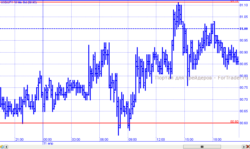 Пара доллар/иена среду, как мы и предполагали, совершила восходящую коррекцию. Достичь уровня 81,00 с первой попытки ценам не удалось и они откатились к поддержке 80,60, которую попытались преодолеть, но неудачно. В результате пара смогла укрепиться на 50 пунктов (максимум торговых суток – 81,11). Но к завершению дня цены снова оказались ниже отметки 81,00, закрывшись в районе уровня 80,85.