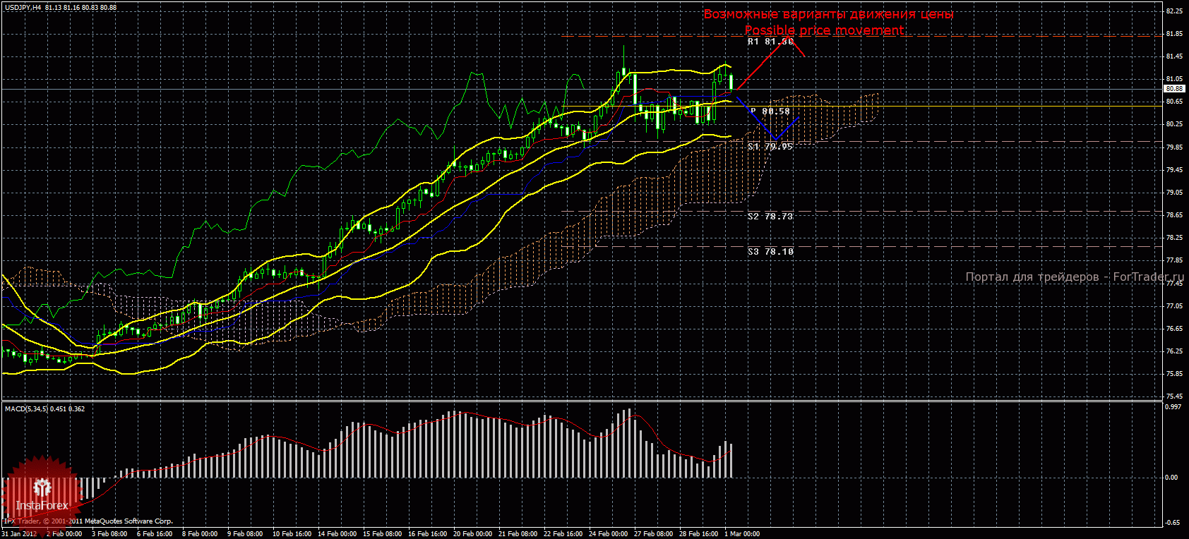 Анализируя курс иены на рынке Форекс 1 марта, видно, что курс японской валюты, после небольшой коррекции вниз, продолжил повышение, однако полосы Боллинжера сейчас указывают на флэт. Таким образом, текущий сигнал на покупку является подтвержденным и сильным, так как Чинкоу Спан располагается выше графика цены, а цена давно уже закреплена выше облака Ишимоку. Поэтому сейчас целью для восходящего движения является первый уровень сопротивления 81,80, но начинать отработку этой цели рекомендуется после начала расширения полос Боллинджера наверх. В случае преодоления торговцами этого уровня, следующим таргетом будет выступать второй уровень сопротивления 82,43. Восходящее движение сохраняется до тех пор, пока цена находится выше Киджун-сен(80,80), в случае закрепления цены ниже этой линии, это поставит под большой вопрос дальнейшую отработку сигнала на покупку и послужит сигналом к возможному развороту цены вниз. Чинкоу Спан находится выше графика цены, что является подтверждением текущему сигналу на покупку и означает бычье настроение участников рынка по валютной паре доллар/иена. Боллинджер Бандс показывает боковое движение, полосы не расширяются и направлены вбок, поэтому до их расширения в какую-либо из сторон заходить в рынок не рекомендуется. MACD направлен вверх, что говорит о текущем восходящем движении, поэтому сейчас открывать и поддерживать уже открытые лонги можно.