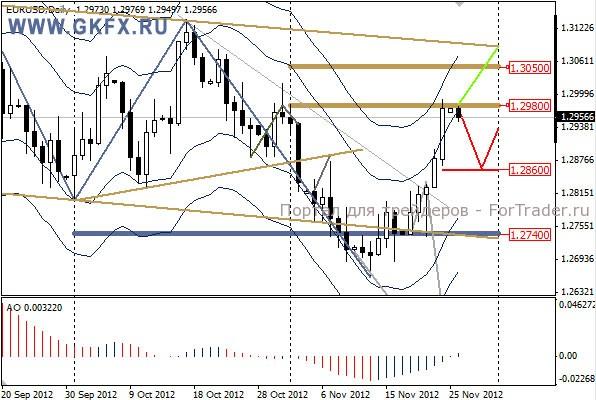 Пара EURUSD на новой неделе предположительно приостановит рост у отметки 1,2980 и корректируется на 1,2860. Далее предположительно вырастет в сторону 1,2980. Это основной сценарий на эту неделю. Альтернативный сценарий подразумевает дальнейший рост до линии тренда в районе 1,3090. Эта неделя будет полноценной и возможно удастся удачно поторговать. Сегодня традиционно ждем, как поведет себя рынок после активной пятницы.