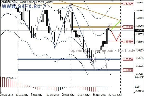 Пара GBPUSD на прошлой неделе придерживалась красного сценария, и в пятницу отклонился от него.  На эту неделю, как и по евро, даю два варианта развития событий. Основной красный, и альтернативный зеленый. Красный сценарий подразумевает откат вниз в район 1,5950/60 и возобновление роста в сторону 1,6000. Зеленый сценарий подразумевает планомерный рост до линии тренда. По пятничной рекомендации руками можно было зайти в рынок с минимальным риском. Если выставлялся ордер, то его, скорее всего не открыло.