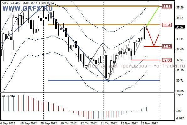 По серебру также выполнился зеленый сценарий и даже с лихом, так как серебро всю неделю склонялось больше в сторону роста. На этой неделе серебро будет придерживаться динамики золота, поэтому рассматривается по нему подобные варианты развития событий. Красный основной сценарий подразумевает некоторый откат вниз в район 32,86 и далее рост в район 33,50/34,00. Зеленый вариант подразумевает рост в район 35,30.