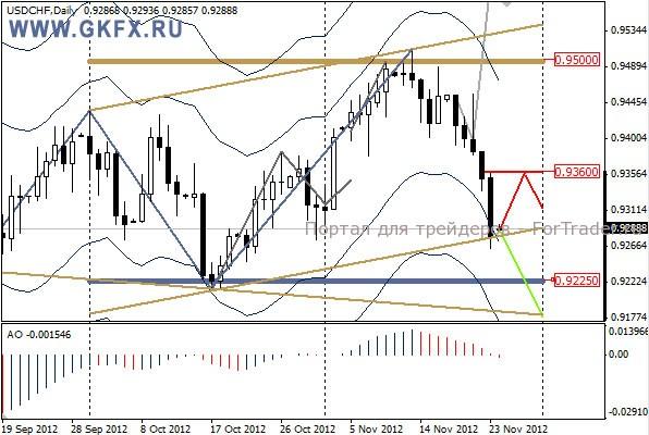 Пара USDCHF придерживалась красного сценария  и в четверг отклонилась от него.  На этой неделе как обычно два сценария. По основному красному сценарию ожидаю откат к 0,9360 от границы восходящего канала и дальнейшее снижение в сторону границы восходящего канала. Зеленый сценарий подразумевает пробитие границы восходящего канала и снижение пары в сторону 0,9180.
