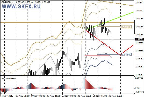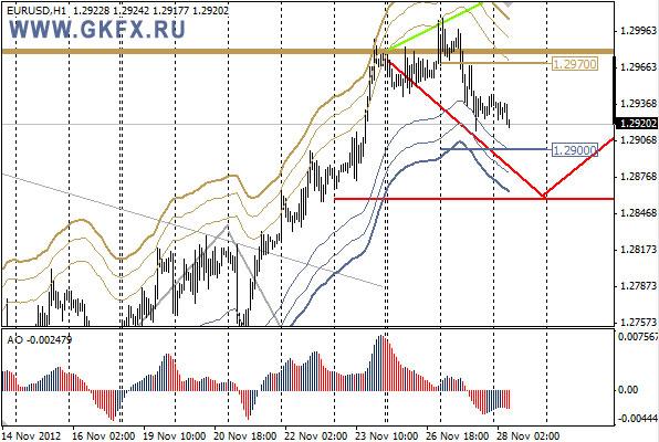 Пара EURUSD начала коррекцию после двух недель роста. Коррекция началась без предположительного рывка наверх к 1,3020. Цель коррекции обозначена красным сценарием на уровне 1,2860, но за счет роста пары в понедельник вечером цель коррекции сместилась на 1,2875. Сегодня если цена скорректирует вчерашнее снижение в район 1,2970, из этой области можно совершать продажи со стопом 1,3005. Цель на сегодня 1,2920.