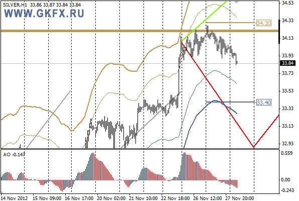 Серебро в отличие от золота снижается менее значительно, а я предполагал напротив более значительное снижение, чем по золоту. Серебро все еще проявляет большую склонность к росту, даже снижается с трудом. Думаю, снижение будет проходить до отметки 33,40, откуда можно покупать. Стоп на 33,20. Первая цель 33,90. Индикатор АО указывает на снижение, поэтому ждем отката до точки входа.