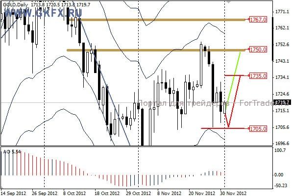 По золоту не один сценарий не совпал на прошлой неделе, волатильность повысились, и сложно стало ориентироваться. Цены летали на протяжении недели туда, сюда. Возможно, на этой неделе напор спадет, и цены начнут адекватно двигаться. На этой неделе традиционно рассматриваю два варианта. Красный вариант подразумевает небольшой откат вниз к 1705,00 и возобновление роста к отметке 1735,00. Зеленый сценарий указывает на продолжение роста в сторону 1750,00. Ждем снижения к 1705,00 и там можно поискать покупки.