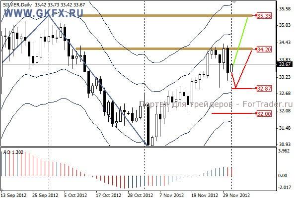 По серебру также выполнился красный сценарий с некоторыми отклонениями. Тем не менее, забрать прибыль не удалось, из-за высокой волатильности. На этой неделе по серебру рассматривается вариант небольшого снижения к 32,87 а затем рост в сторону 34,20, это красный вариант. Зеленый вариант подразумевает рост в район 35,35. Ждем снижения к 32,87 и там можно поискать покупки.