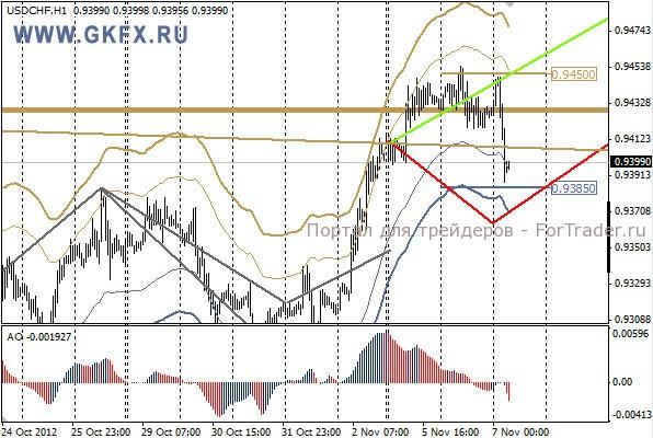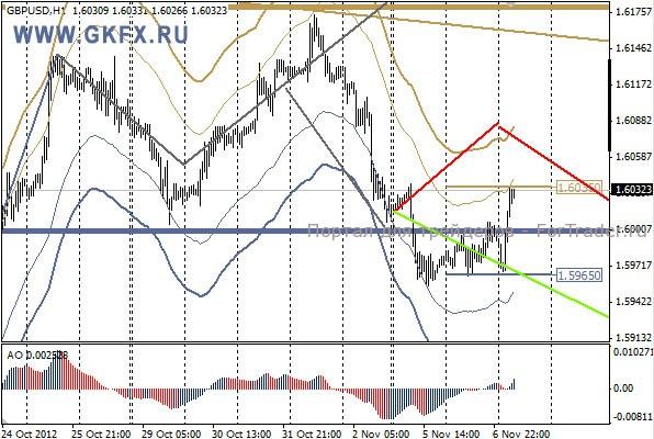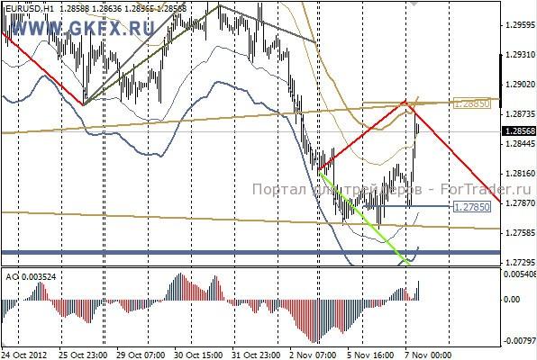 На текущий момент пара EURUSD торгуется с повышением. Оба сценария нарушены. Пока больше походит на красный вариант, поэтому его будем придерживаться. По этому сценарию рост будет до уровня 1,2885 и затем возобновится снижение. Индикатору АО сигнализирует о росте. Следует подождать тестирования этого уровня. Если цена отскочит от него, даже с некоторым превышением и будет держаться ниже, хотя бы пару часов, можно пробовать продать со стопом выше сформированного максимума. Цель 1,2805. Фундаментальные факторы на сегодня это победа в президентских выборах Обамы, и голосование по мерам строгой экономии в Греции.