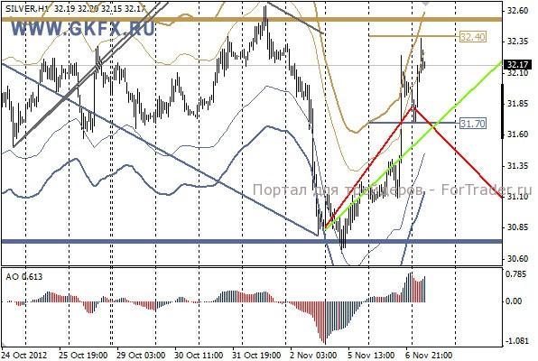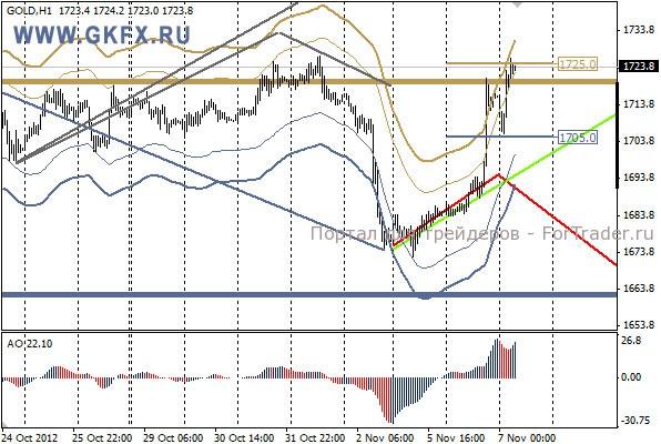 По золоту похоже зеленый сценарий берет верх. Победа Обамы на выборах позитивный момент для золота. Поэтому сейчас можно рассматривать покупки. Вчера золото сильно подорожало, не дав возможности зайти в рынок. Сейчас цена на золото тестируют сопротивление 1720-25, при прохождении которого откроется дорога к 1750. Если сегодня цена откатится вниз, завтра можно попытаться купить. Диапазон торгов на сегодня указан на графике. Сегодня вне рынка.