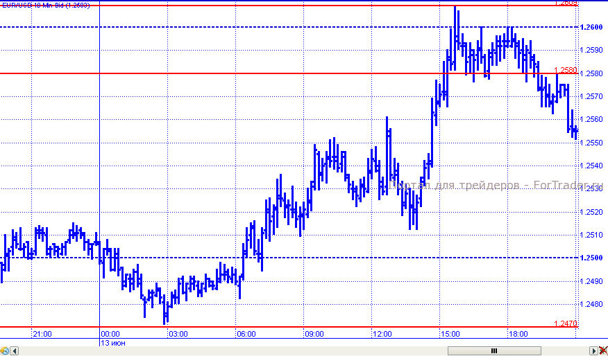 Евро отказывается сдаваться. Среду он завершил в небольшом плюсе по отношению к доллару без особых на то причин. В начале торговых суток пара вернулась к уровню 1,2470. Но впоследствии пара начала рост, в рамках которого преодолела сопротивление 1,2540 и 1,2580. А вот уровень 1,2600 устоял, хотя цены пытались пройти и его (максимум дня отмечен на 1,2609). Потерпев неудачу к закрытию дня пара откатилась к уроню 1,2550.