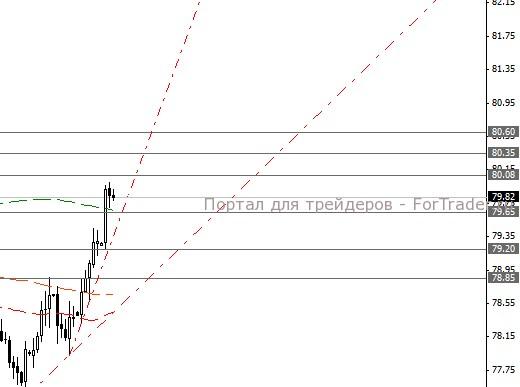 Пара USD/JPY ограничена сопротивлениями вблизи 80.08, 80.35 и 80.60, а также поддержками 79.65, 79.20 и 78.85.