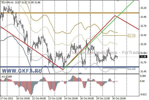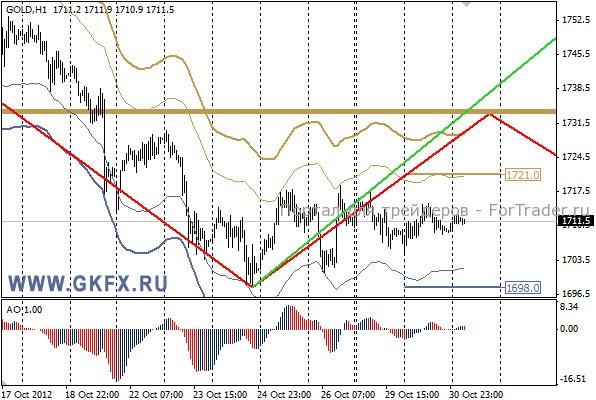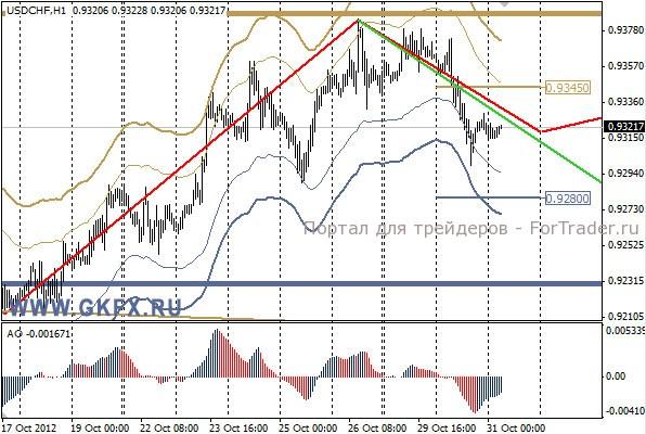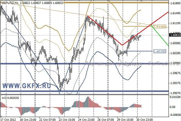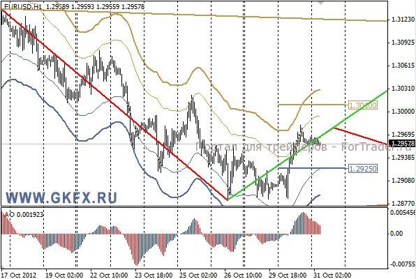 Позитивные результаты по европейским данным оказали положительное влияние на евро. Доллар тем временем оставался под давлением из-за урагана Сенди. Пара EURUSD пошла на намеченной траектории. Объемы на ранке по-прежнему низки из-за последствий урагана Сенди в США. Возможно, сегодня биржи в США продолжат вынужденные выходные. Пятничный минимум не был принижен, поэтому план по евро остается в действии. Однако пара вчера достигла точки, когда сценарии расходятся. Можно сегодня попробовать купить от отката к 1,2955/35. Стоп ниже 1,2920, цель небольшая 1,2980. Индикатор АО указывает на формирование отката вниз, поэтому лучше не спешить.