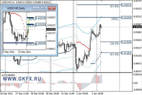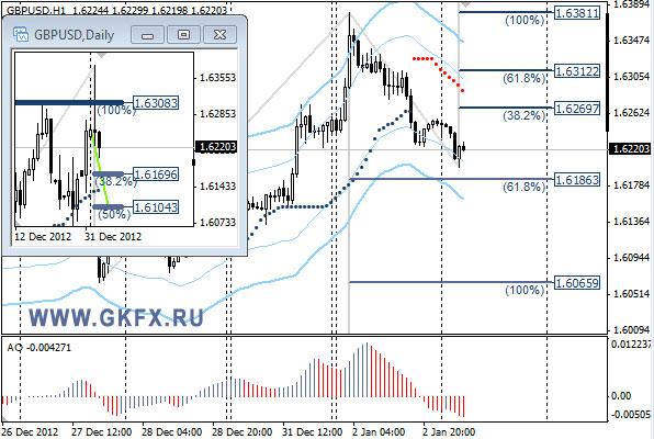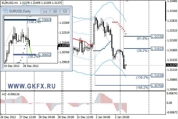 Пара EURUSD торгуется с понижением после попыток вчера пройти сопротивление 1,3300 на новостях о достижении соглашения для предотвращения «фискального обрыва» в США. Как оказалось соглашение достигнуто только по некоторым вопросам, поэтому противостояние Либералов и Демократов продолжится в скором времени. На часовой график наложил дневной график с ожидаемым движением цены на неделю. Значимые уровни на сегодня отмечены на графике. Индикатор АО в отрицательной зоне, указывая на желание пары снижаться. Индикатор тренда указывает на снижение. Привлекательного входа в рынок нет, поэтому вне рынка.