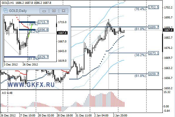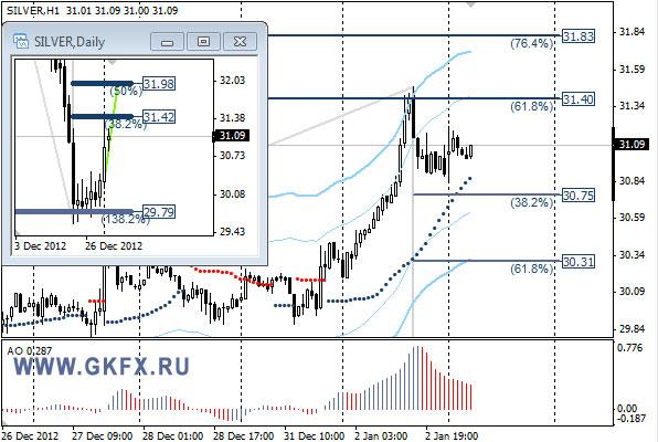 Золото вышло из диапазона вверх, в котором торговалось неделю. Разрешение ситуации с «фискальным обрывом» в США пошло на руку золоту. Индикатор тренда вновь стал актуальным, как только цена вышла из диапазона. Значимые уровни на сегодня отмечены на графике. Индикатор АО в положительной зоне и снижается, указывая на коррективное снижение, которое может продолжиться ростом. Индикатор тренда указывает на рост. Можно попытаться купить с текущих уровней, но место рискованное, по Фибоначчи нет поддержек.