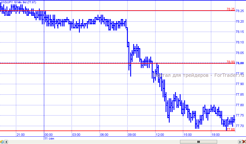 Иена не замедлила воспользоваться слабостью доллара. Пара доллар/иена, начав день в пределах крайне узкого диапазона 78,15 – 78,25 устремилась вниз, преодолела поддержку 78,00 и продолжила падение, отметив внутридневной минимум на уровне 77,68.