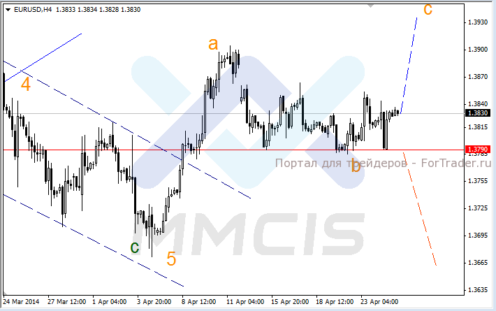 В качестве основного сценария рассматривается рост пары в направлении отметки 1.3950 в рамках волны «с». В качестве альтернативного сценария рассматривается пробой уровня поддержки 1.3790, после чего рынок будет стремиться к минимуму волны «5», в район уровня 1.3700.