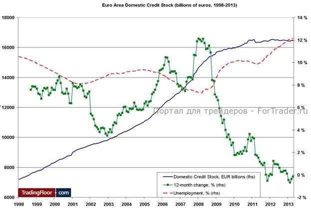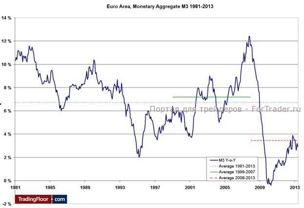 Согласно прогнозам, денежная масса М3 в еврозоне увеличилась на 2,9% по сравнению с прошлым годом, то есть чуть меньше, чем в предыдущем месяце, когда показатель роста составил 3,2%. Частные займы предположительно сократились на 0,9% по сравнению с годом ранее. Динамика ежемесячных изменений в последнее время стабилизировалась, а узкий денежный агрегат М1 показал неплохой прирост в прошлом месяце. Как правило, это влечет за собой увеличение более широкого агрегата спустя несколько месяцев, но ситуация в Европе сейчас далека от нормы.