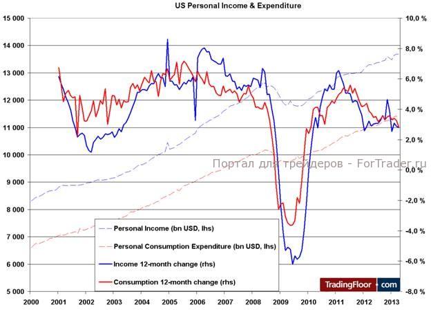 Вчера стало известно, что по итогам пересмотра оценка роста ВВП в первом квартале значительно понизилась с 2,4% до 1,8%, причем наибольшее ухудшение было зафиксировано в сегментах частного потребления и инвестиций. Я вкратце рассказал о такой возможности вчера. Дополнительно на эту тему можно почитать на сайте WSJ. Такое сильное ухудшение Федеральная резервная система не может игнорировать, поэтому вполне возможно, что паника на рынке по поводу сворачивания стимулирующих мер на время прекратится, так как игроки начинают строить предположения о том, что ФРС может отложить этот процесс. Одновременно сегодня выходит ценовой индекс PCE, и поскольку низкая инфляция является одним из параметров, которые учитывает ФРС, то и вам следует обратить на нее внимание. Чистый индекс PCE предположительно вырос всего на 0,1%, что очень мало.