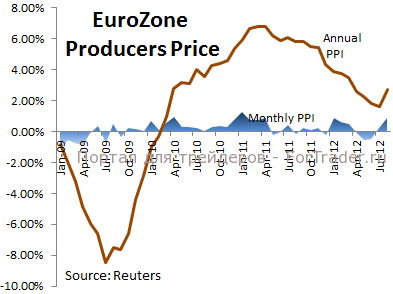 PPI Еврозоны в годовом эквиваленте вырос в августе на 2.7%, в сравнении с пересмотренными июльскими 1.6% роста, максимальным значением с марта 2012. В то же самое время PPI в месячном эквиваленте вырос в августе на 0.9%, по сравнению с пересмотренными в июле 0.5%, сообщило агентство Евростат. Ожидалось, что ежемесячный PPI увеличится на 0.5%, а ежегодный на 2.6%.