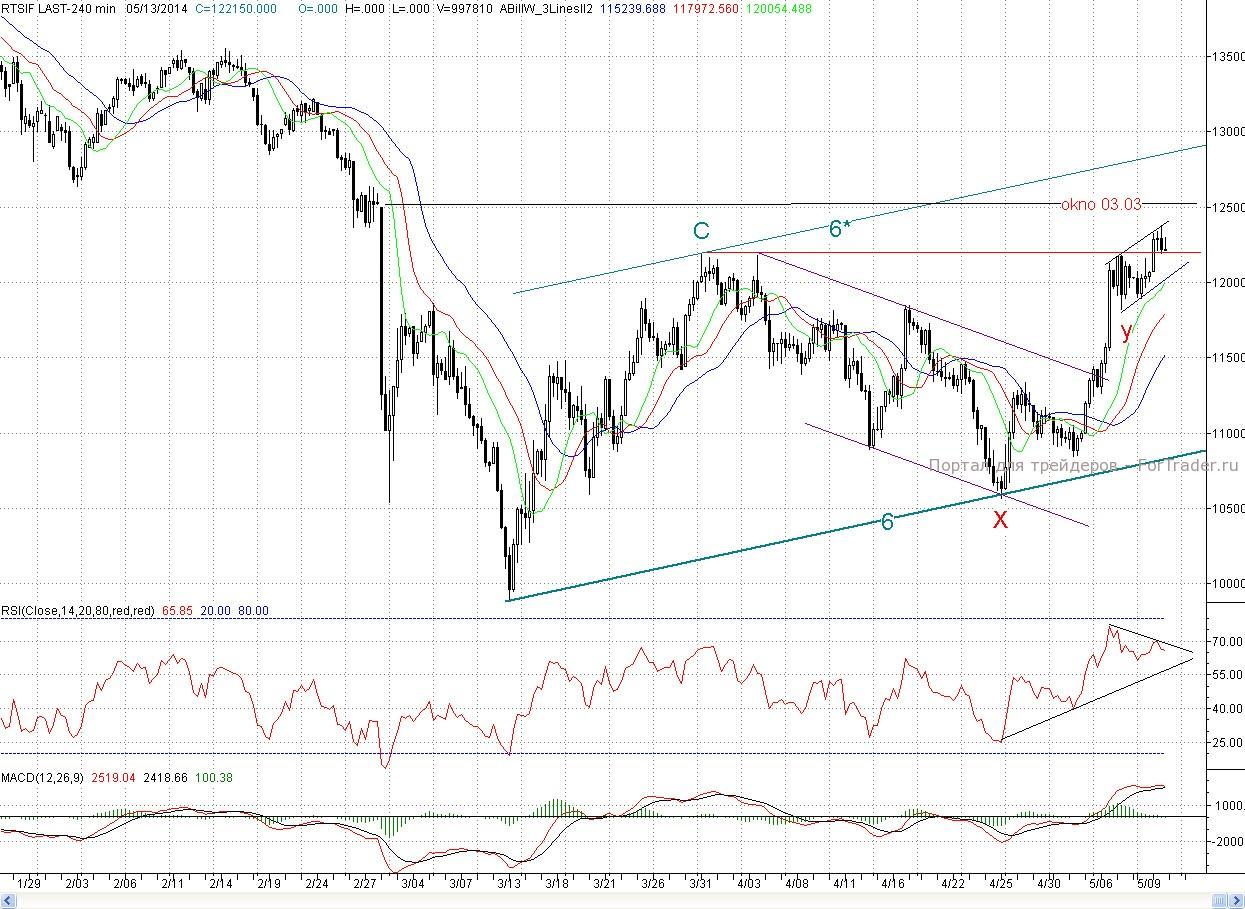 Таким образом, прошедшая сессия оставила двойственные впечатления. С одной стороны ключевой редут медведей был преодолен. Однако сделано было это неуверенно (цены были выше всего на 0,5%, а к окончанию торгов они оказались и вовсе ниже данного уровня). Объемы торгов, хотя и возросли по сравнению с понедельником, но были существенно ниже, чем в среду и четверг на росте прошлой недели. Так что пробой может оказаться и ложным. Посмотрим, что по этому поводу скажет «товарищ Теханализ». Итак, после преодоления верхней грани вчерашнего вымпела дальнейший рост не получил своего продолжения. Более того, трехдневную проторговку уже можно рассматривать и как «клин», а это уже медвежья модель. К тому же по 2- часам образовались новые дивергенции как по RSI, так и по гистограмному MACDу. Аналогичная картина и на 4- часовом графике по фьючерсу на индекс РТС.