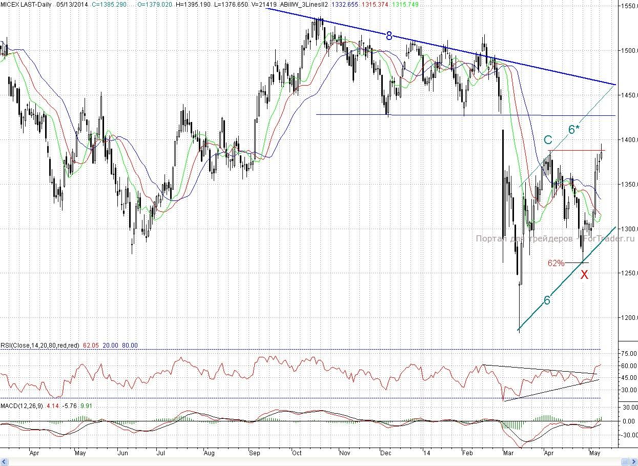 Исследуя 2-часовой график индекса ММВБ. видим, что на позитивном внешнем фоне, открывшись с гэпом вверх, котировки продолжили рост и сумели преодолеть ключевой редут медвежьей обороны в лице апрельского максимума С (1 388 п.). Однако развить свое наступление покупатели не сумели. Более того, ближе к закрытию продавцы перешли в контрнаступление и сбросили быков с завоеванного плацдарма. Но дальше продолжать атаку сил у медведей не хватило. В результате день завершился в плюсе (0,72%), а индекс РТС за счет укрепления рубля прибавил 1,62%