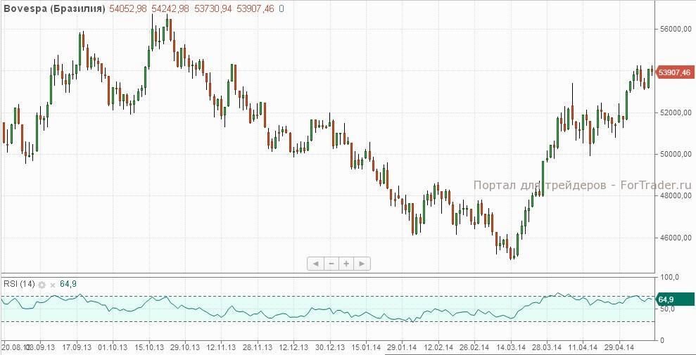 На дневном графике, образовавшаяся дневная свеча, хотя и не «падающвя звезда», но также не оптимистична для покупателей. К тому же медленная кривая MACDа по прежнему еще находится на отрицательной территории. Так что вчерашний максимум (1 395,19 п.) может оказаться для быков и лебединой песней. А чтобы этого не произошло, необходимо чтобы в полку покупателей прибывало. Однако этого не видно. События на Украине пока перестали оказывать влияние на наш рынок, и все внимание игроков снова сконцентрировалось на мировые площадки. А там, хотя вчера и DJIA и S&P500 обновили исторические максимумы, но сделали это неуверенно, и дневные свечки могут оказаться и разворотными. Бразильская Bovespa, после почти двухмесячного роста также начала пробуксовывать. Так что в случае начала коррекции на мировых рынках, российский в стороне от этого процесса тоже не останется. Поэтому и этот фактор довлеет над покупателями и им надо быть осторожными, чтобы не попасть под возможный «медвежий каток».