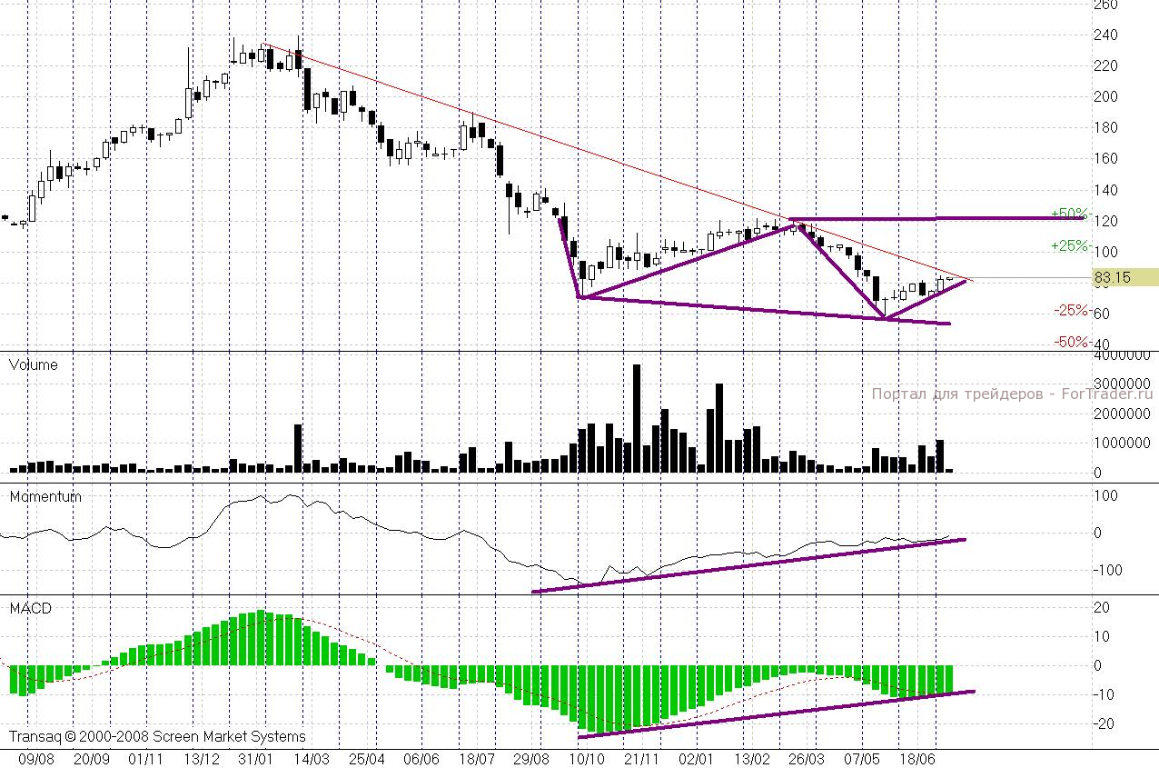 В принципе, уже можно рассчитывать на реализацию этих сигналов, так как малый нисходящий тренд между первым и вторым дном пробит. Но я подожду пробой глобального уровня сопротивления – нисходящего тренда от февраля 2011 года 85-86 рублей. Цель моей будущей покупки — 120 рублей. Вторую цель сигналов определить сложно — это может быть и уровень 180 рублей, и район 230 рублей. Добавлю, что объемы уже намекают на силу «быков».