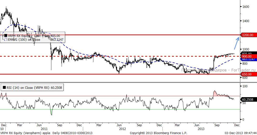 Мы по-прежнему придерживаемся цели 1200 руб. за одну акцию Верофарм. Техническая картина складывается в пользу роста. Средняя граница диапазона 650 – 1200 руб. была пробита, так что покупки можно совершать уже по текущим значениям.