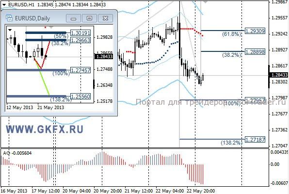 Пара EURUSD резко снизилась в ходе выступления председателя ФРС Б. Бернанке. Его выступление показало, что вектор намерений движется в сторону сокращения QE3. В результате индекс доллара вновь превысил отметку 84,00 и уверенно пошел вверх, что неминуемо сказалось на евро. Далее по евро рассматриваем только продажи. По рекомендации вчера ордер сработал и перед выступлением Бернанке, была возможность поставить стоп в безубыток, он и сработал, так как начались резкие колебания цены в начале выступления Бернанке. На эту неделю традиционно рассматриваю два варианта возможного движения цены, основной красный и альтернативный зеленый. Значимые уровни на сегодня отмечены на часовом графике. Индикатор АО находится в отрицательной зоне и снижается, указывая на желание пары идти вниз. Индикатор тренда указывает на снижение. Sell от 1,2845 или выше со стопом 1,2865. Цель 1,2750. Не забываем ставить стоп в безубыток при первой же возможности.